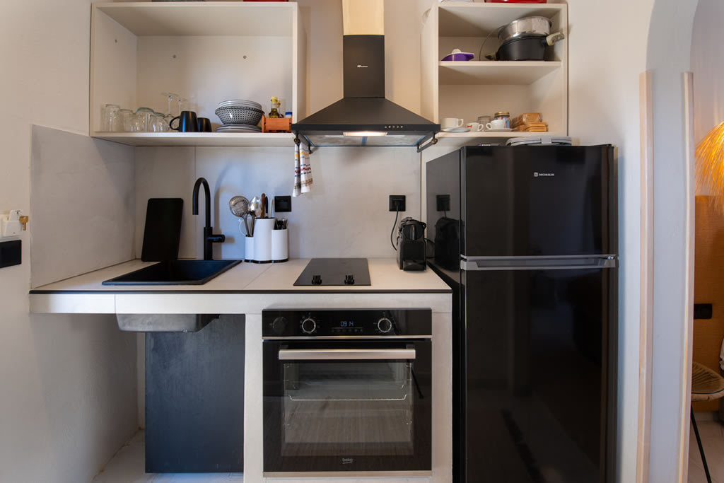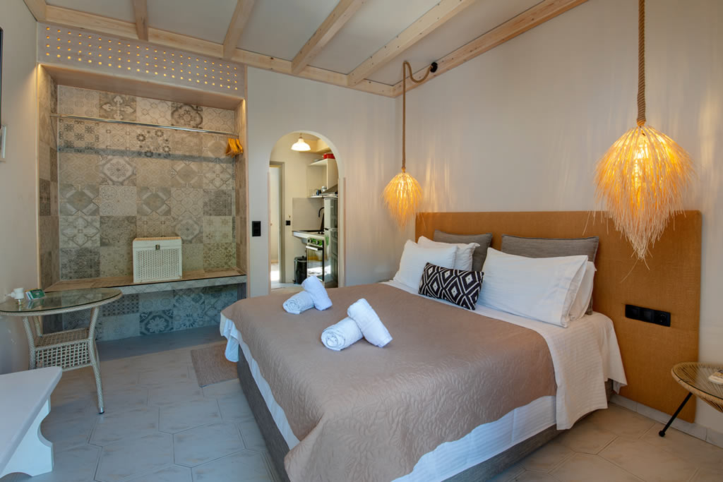 Στο εσωτερικό, η ξύλινη οροφή με κορμούς πεύκου και τα boho φωτιστικά δημιουργούν μια ζεστή, χαλαρωτική ατμόσφαιρα. Το άνετο υπέρδιπλο κρεβάτι εξασφαλίζει ξεκούραστο ύπνο, ενώ η minimal κουζίνα με ρετρό φούρνο, επαγωγική εστία και ματ μαύρες λεπτομέρειες είναι πλήρως εξοπλισμένη για κάθε ανάγκη. Το μοντέρνο μπάνιο διαθέτει ντους με γυάλινο διαχωριστικό και διακοσμητικές λεπτομέρειες από φυσικά υλικά.