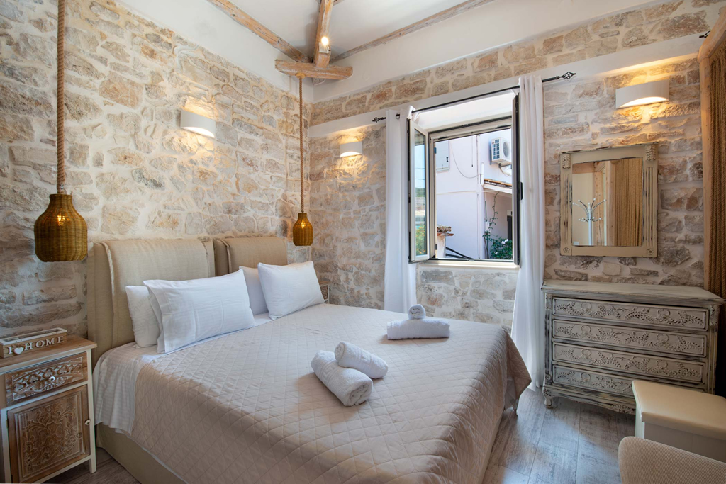 Το εσωτερικό διαθέτει εμφανείς πέτρινους τοίχους και ξύλινες οροφές, δημιουργώντας μια ατμόσφαιρα αυθεντικής γοητείας με σύγχρονη πολυτέλεια. Ο ενιαίος χώρος καθιστικού διαθέτει έναν άνετο λευκό καναπέ με έντονα κόκκινα μαξιλάρια, μια μεγάλη τηλεόραση επίπεδης οθόνης και ένα ενσωματωμένο τζάκι με ατμοσφαιρικό φωτισμό. Η κουζίνα, ειδικά σχεδιασμένη, διαθέτει ασβεστωμένα ξύλινα ντουλάπια, σύγχρονες συσκευές, όπως πλυντήριο πιάτων και ενσωματωμένο φούρνο, και μια ξύλινη τραπεζαρία με γωνιακό σκελετό που μπορεί να φιλοξενήσει 4-6 άτομα.