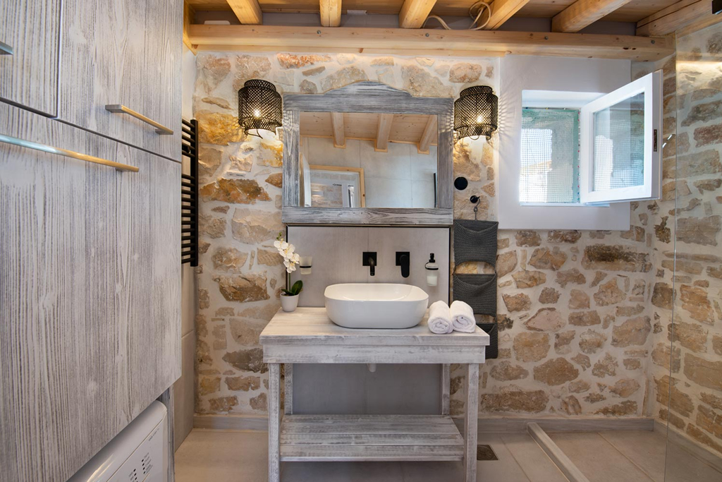Το εκλεπτυσμένο μπάνιο συνδυάζει φυσική πέτρα με μοντέρνα έπιπλα, όπως ντους ψιλής βροχής, σύγχρονο νιπτήρα και πολυτελή προϊόντα περιποίησης. Η ιδιωτική βεράντα με έπιπλα από υψηλής ποιότητας rattan, είναι ιδανική για δείπνο και χαλάρωση μετά την βόλτα στους Παξούς. Οι αναδιπλούμενες τέντες και ο ανεμιστήρας οροφής εξασφαλίζουν άνεση όλη την ημέρα.