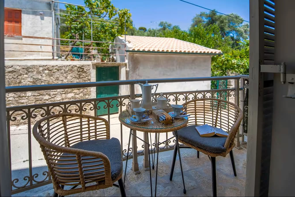 Η ιδιωτική πλακόστρωτη βεράντα με ρατάν έπιπλα και ψάθινες ομπρέλες είναι το ιδανικό σημείο για ένα πρωινό στον ήλιο ή ένα χαλαρό δείπνο στο δειλινό.